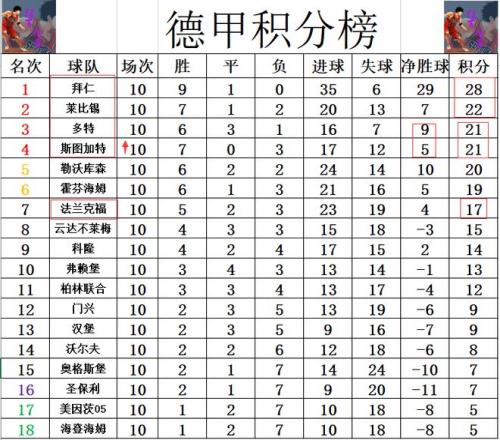 德甲最新积分战报斯图加特逆转差拜仁7分法兰克福4轮不败升第7