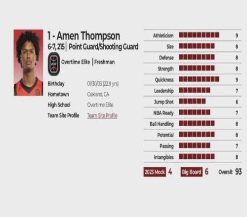 首先是阿门,综合评分93分,预计选秀顺位首轮4-6顺位,选秀模板是拒绝2100万美元合同称不够养孩子的狂人斯普瑞维尔,Jump Shot跳投评分仅有6分,是巨大短板,Leadership领导力、NBA Ready准备、Passing传球仅有7分稍显不足,Athleticism强壮度和Quickness速度9分说明其运动能力非常出色,网站评语如下(精简内容):