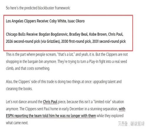 美媒策划快船跟公牛交易,可换来两乐透秀,送四人+未来首轮签