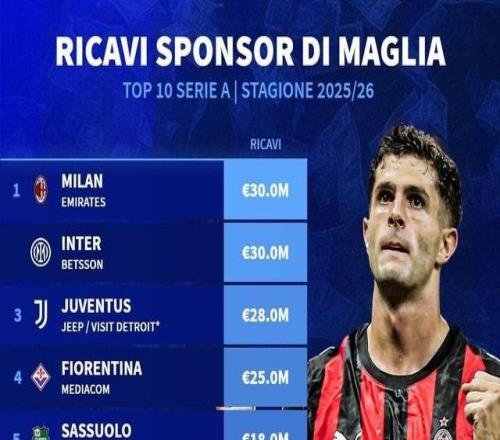 意甲俱乐部球衣胸前广告赞助费TOP10:米兰双雄3000万并列第1 -